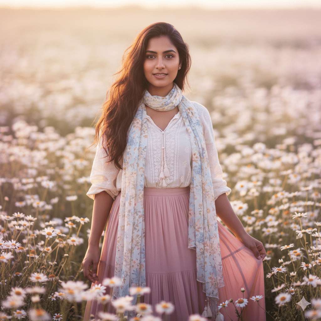 “Create an ultra-realistic 4K cinematic image of a young Indian woman styled in a pastel boho outfit, standing in a daisy field. The outfit includes a soft pastel top, flowy skirt, and a light scarf draped elegantly. Hair worn open with natural waves. Skin tone warm Indian complexion with detailed realism. Expression confident yet gentle. Lighting should be soft morning sunlight with pastel highlights. The background should feel lush and dreamy with cinematic blur.”
