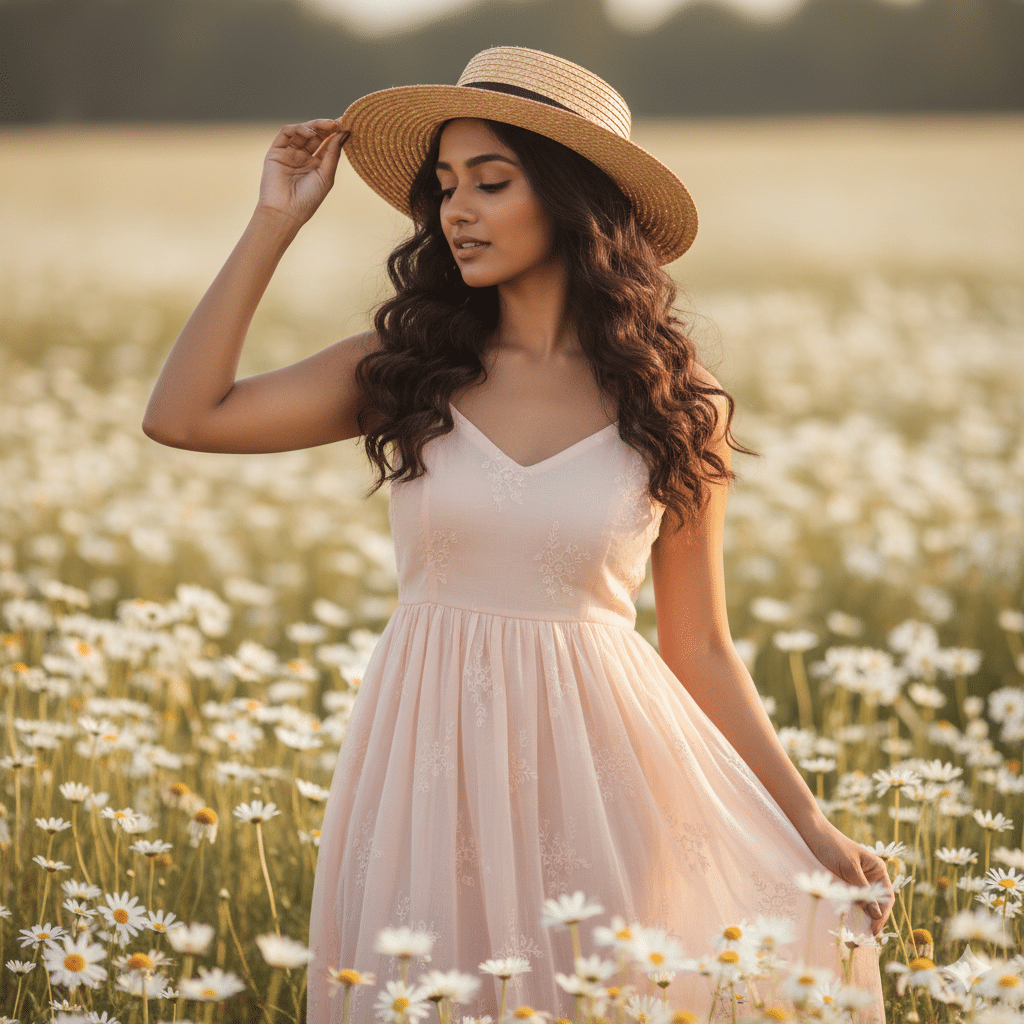 “Generate a pastel-toned cinematic portrait of a young Indian woman wearing a pastel dress and a wide-brim hat, standing in a daisy field. She holds the hat lightly with one hand and looks downward gracefully. Skin tone is natural with a soft glow. Hair styled in loose curls. Lighting is warm and diffused with pastel color grading. The background should be dreamy and softly blurred, perfect for Instagram aesthetics.”