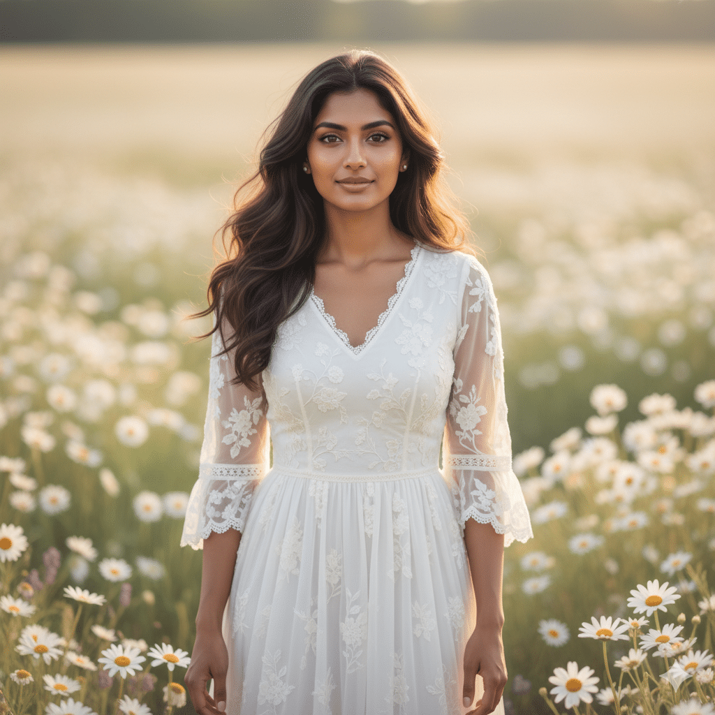 “Create a 4K ultra-realistic cinematic portrait of a young Indian woman (age 23–26) standing in a soft pastel daisy meadow. She is dressed in a flowing white floral dress with subtle lace accents, creating a refined and elegant appearance. Her skin tone should reflect a natural warm Indian complexion with realistic texture and gentle glow. Hair worn loose in soft waves, lightly lifted by the breeze. Facial expression calm and confident with a gentle smile. Use natural daylight with pastel cinematic tones. The background should feature softly blurred white and yellow daisies, producing a dreamy, editorial-style aesthetic.”