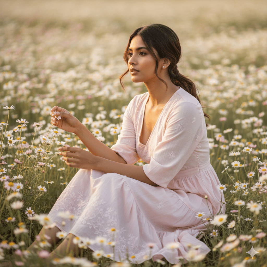 Soft pastel daisy field portraits have become one of the most loved aesthetic photo trends among young Indian women. These images reflect calmness, elegance, and a fairytale-like charm that performs extremely well on Instagram, Pinterest, and lifestyle blogs.
