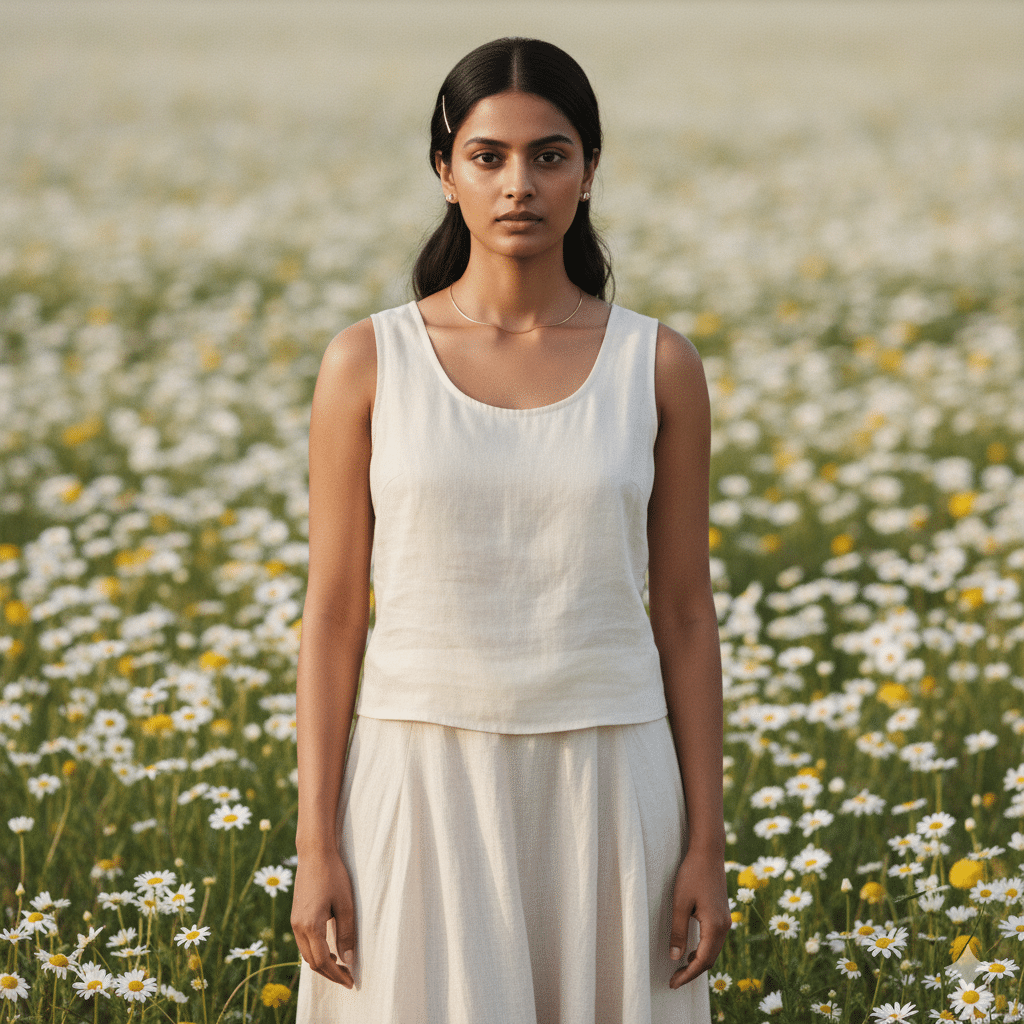 “Produce a high-quality cinematic portrait in 4K resolution of a young Indian woman wearing a light beige pastel top paired with a flowing skirt. She stands confidently in a daisy field with arms gently crossed and a composed expression. Hair sleek and straight, makeup minimal and natural. Skin tone accurate to Indian complexion with visible realism. Use soft afternoon sunlight with gentle shadows. The background should include pastel daisies and greenery with shallow depth for a polished, modern portrait.”