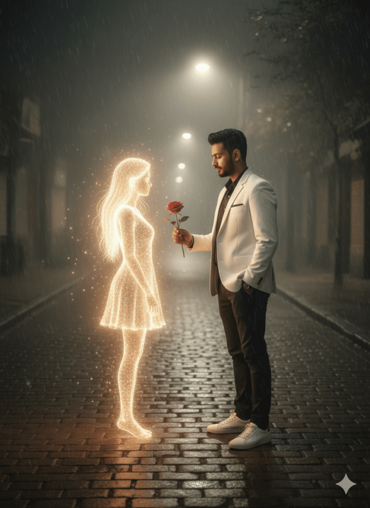 A slender Indian man (keep my face 100% accurate as the reference image) stands on a foggy, dimly lit street at night. He is holding a single red rose in his hand, offering it gently forward with a soft emotional expression. He is wearing a white blazer, black pants, and clean white sneakers — modern, classy, and minimal. In front of him appears a glowing female hologram — a beautiful, softly illuminated digital figure formed from floating light particles. She has long flowing hair made of light and a soft white glow that blends naturally into the misty atmosphere. Her presence feels dreamy, gentle, and artistic — like a surreal, futuristic vision. The street around them is covered in light fog, with subtle reflections on wet cobblestones creating depth and realism. Dim streetlights cast warm highlights and long soft shadows, making the scene cinematic, emotional, and visually poetic. The entire moment feels like a blend of reality and imagination — calm, meaningful, and beautifully aesthetic.