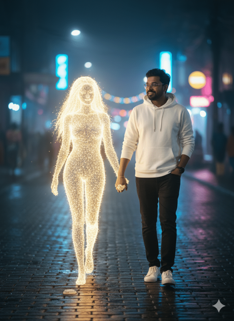 A young Indian man is walking along a calm, dreamy street at night. The road is slightly reflective, showing soft neon lights from distant buildings and blurred city bokeh. He is wearing a white hoodie, black jeans, and clean white sneakers, giving him a modern and casual look. Beside him walks a glowing neon-style girl, created in a beautiful golden light illustration style — like a futuristic hologram or AI-generated digital companion. Her soft golden glow casts warm reflections on the street and subtly lights up the edges of the man’s hoodie. The man gently holds her hand while walking, creating a sense of connection and warmth. The atmosphere feels calm, artistic, slightly surreal, and cinematic — blending fantasy with realism. The lighting is soft, moody, and visually aesthetic, with detailed textures, realistic shadows, and smooth highlights. The background remains lightly blurred to keep focus on the characters.